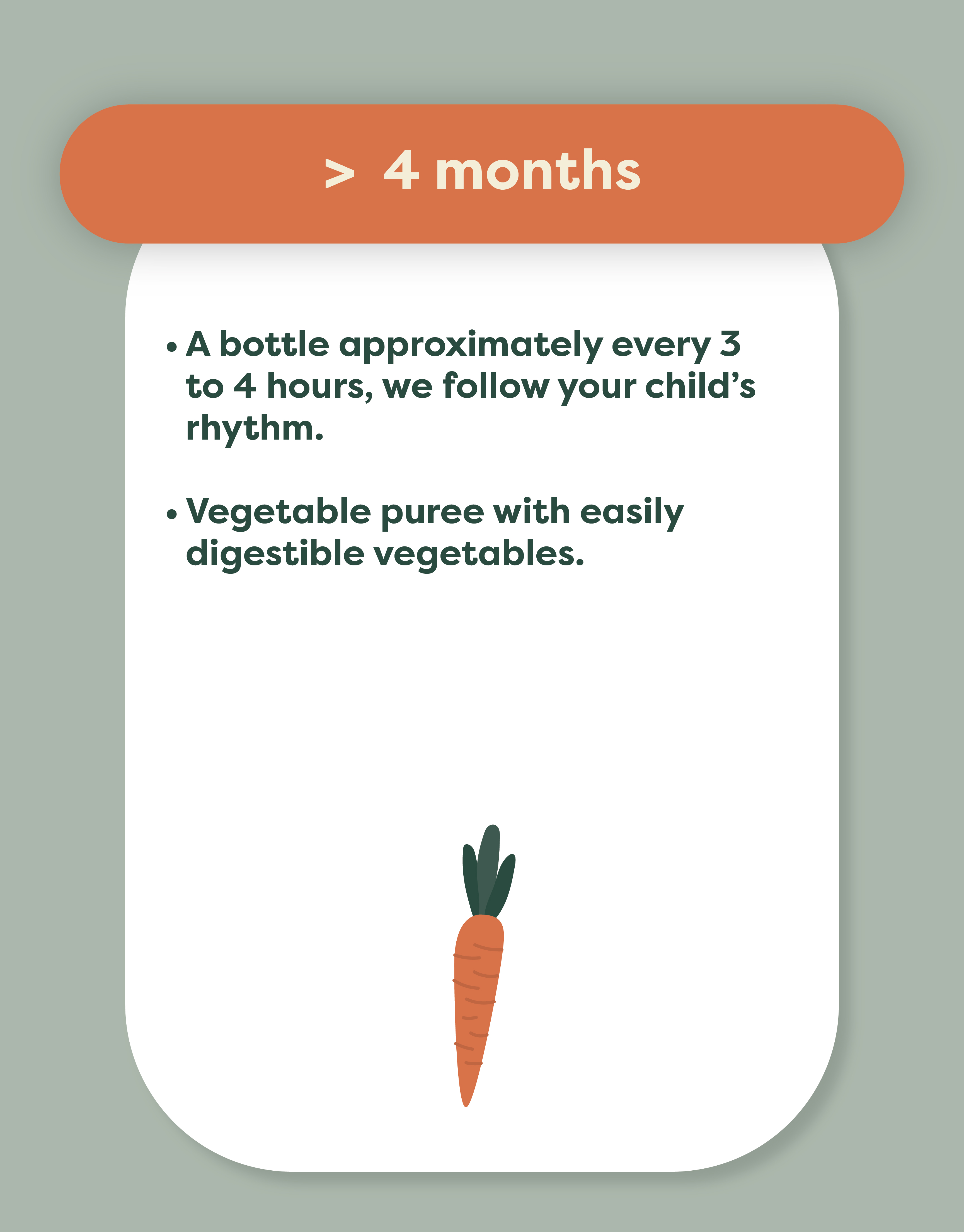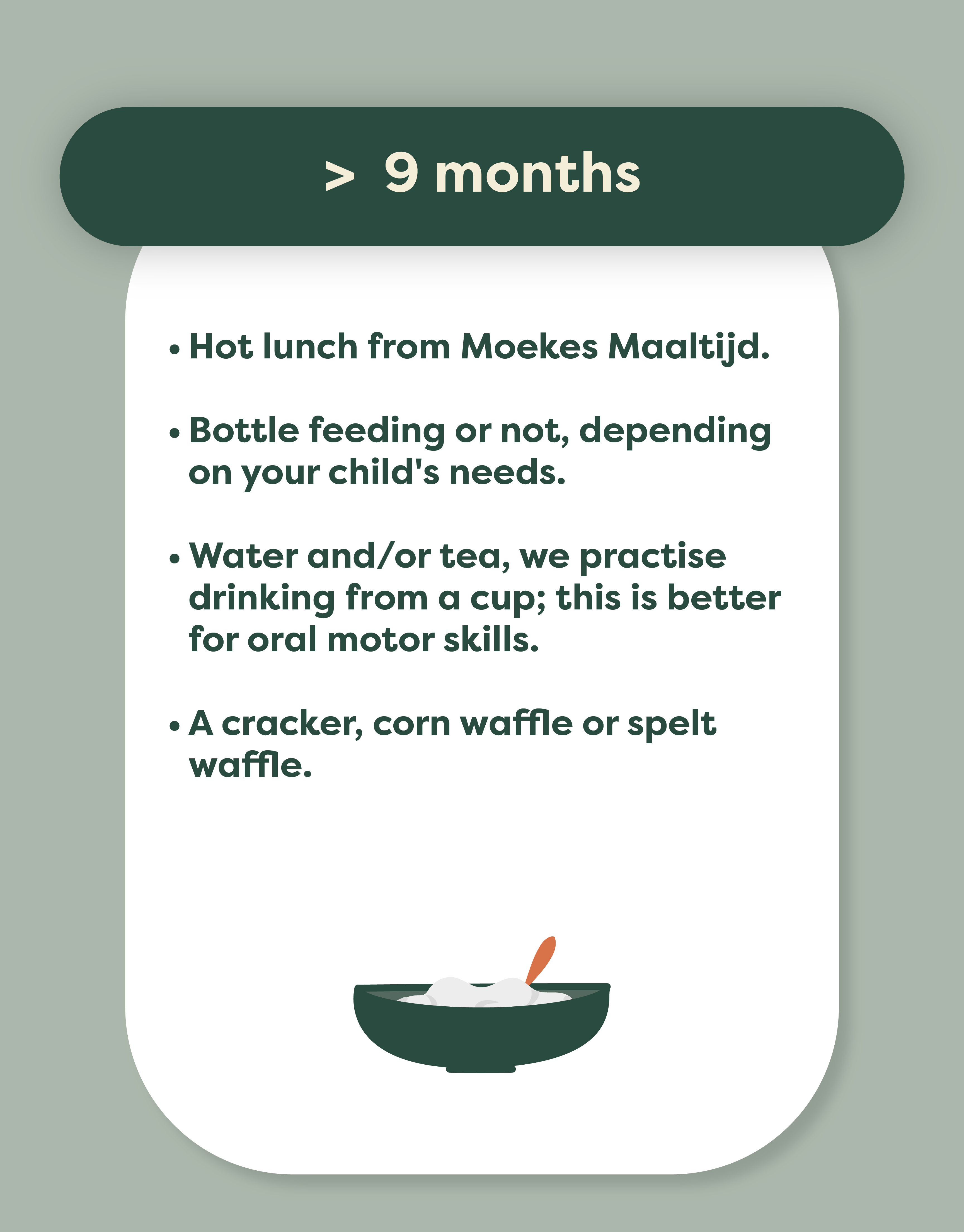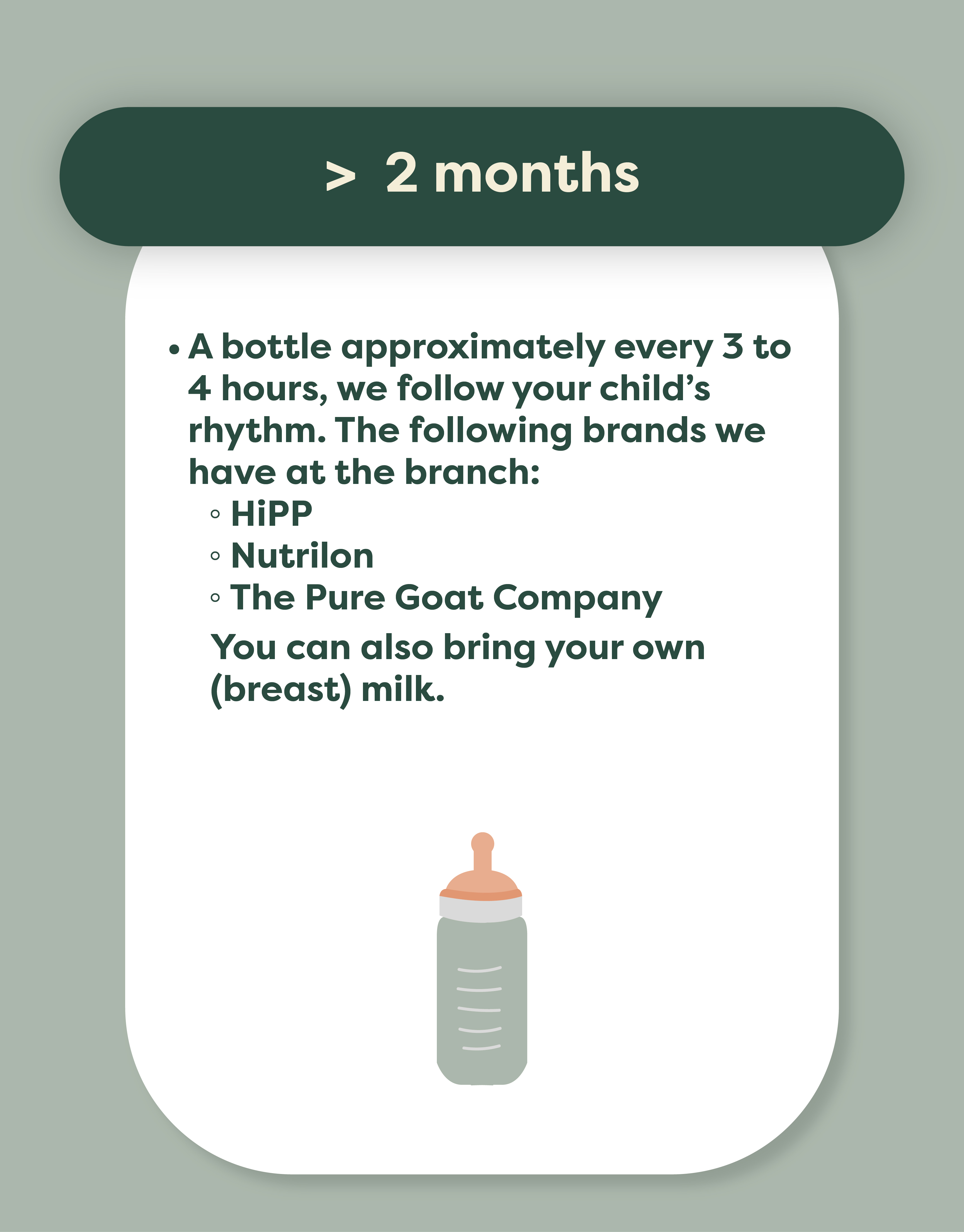 In your child's first year of life, we take a close look at what suits your child's needs and rhythms. We start with bottle feeding and gradually build up to solid food. We provide a variety of vegetables, fruit, crackers and spreads and let the children choose what they want to eat. Our meals and snacks are always healthy and responsible!