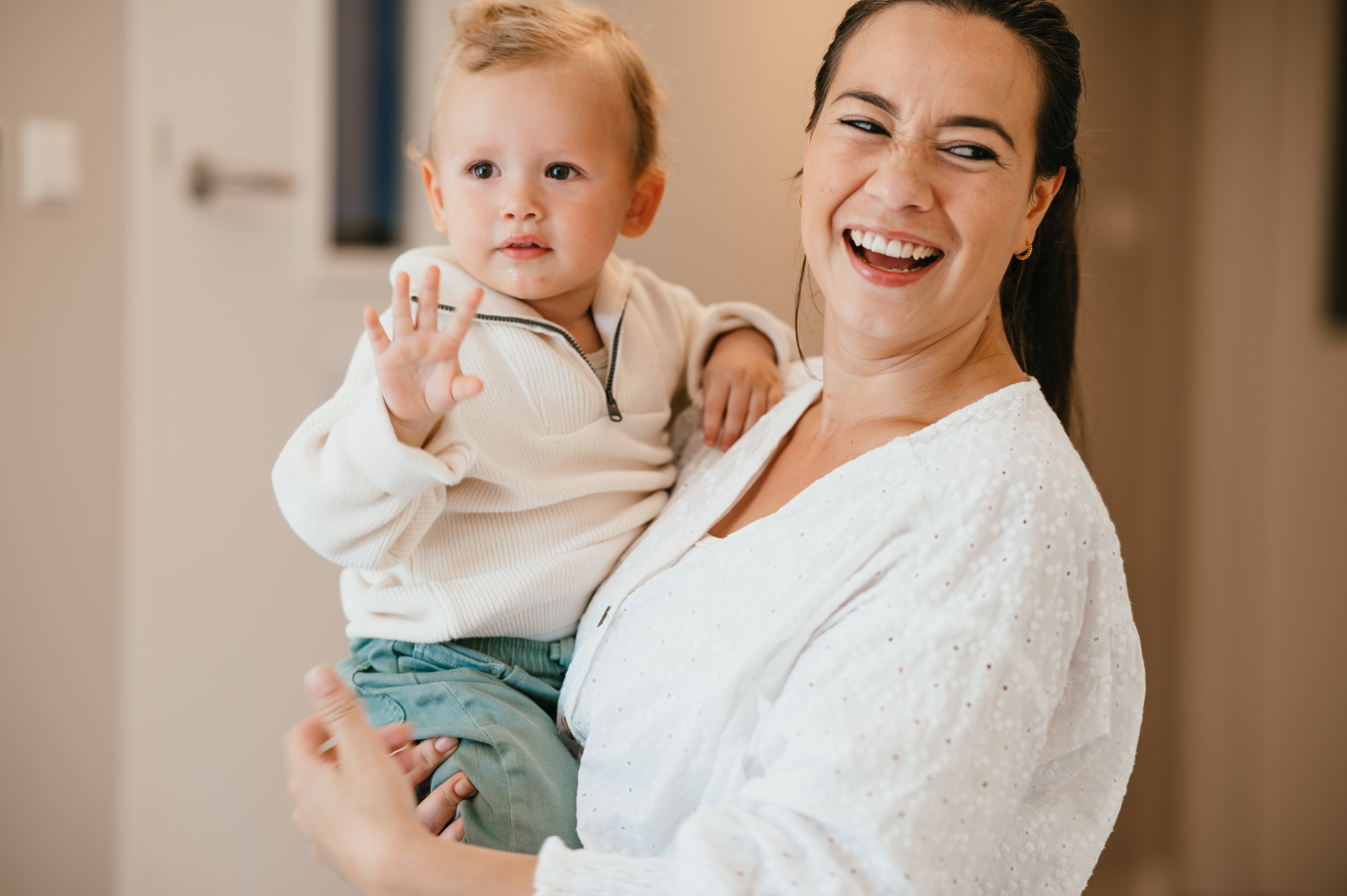 Dreumes zit op de grond en lacht naar camera